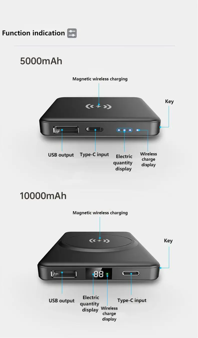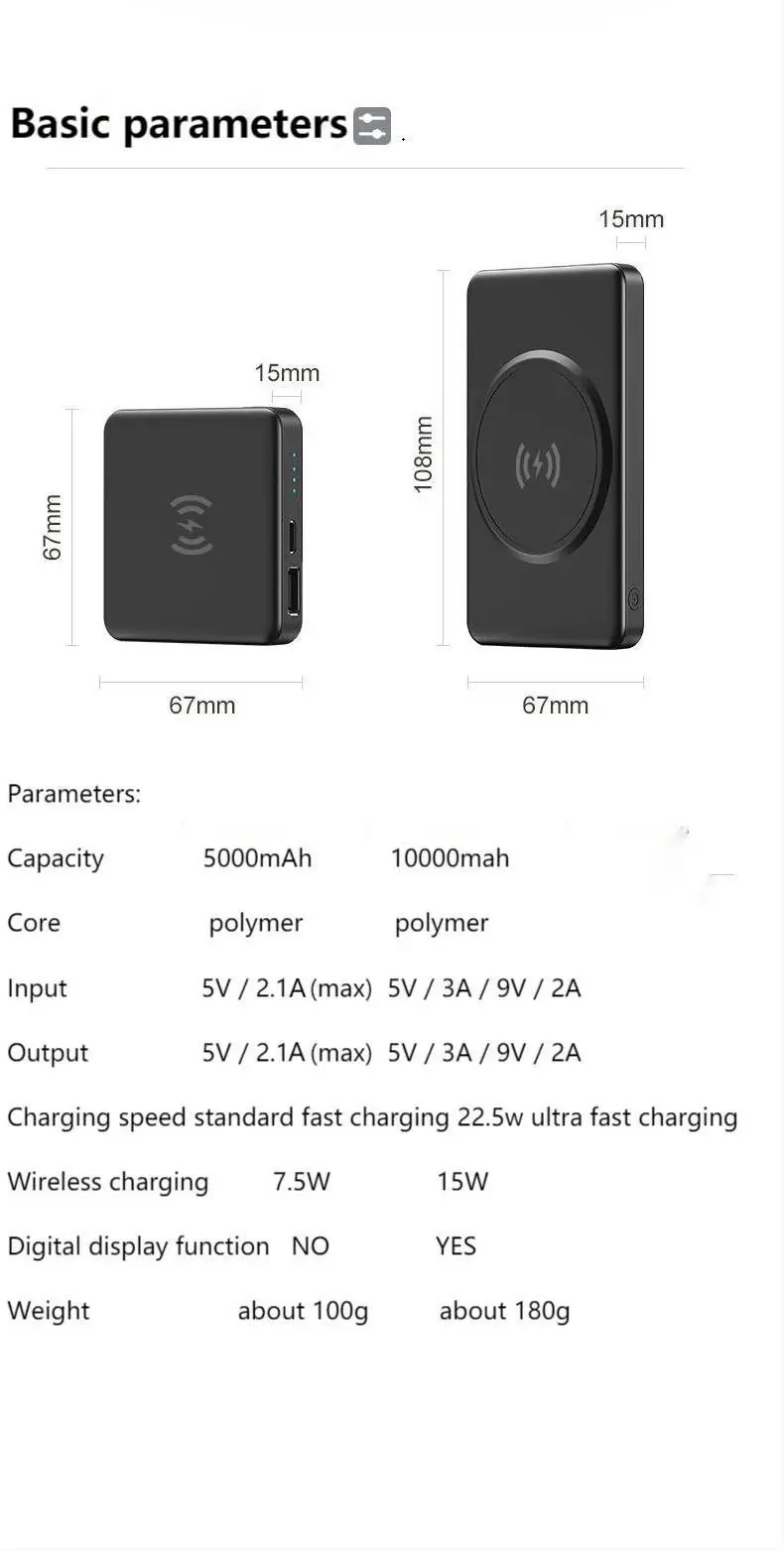 Brand: ArvinCell type: polymer lithium ion cellApplicable type: general purposeBattery type: square aluminum shellShell material: plasticAdditional function: multi-U port outputColor:Black, blue, green, gray, whitePower capacity: 5000mAh, 10000mah (with magnetic suction + 15W wireless charging + pd22.5w ultra fast charging)