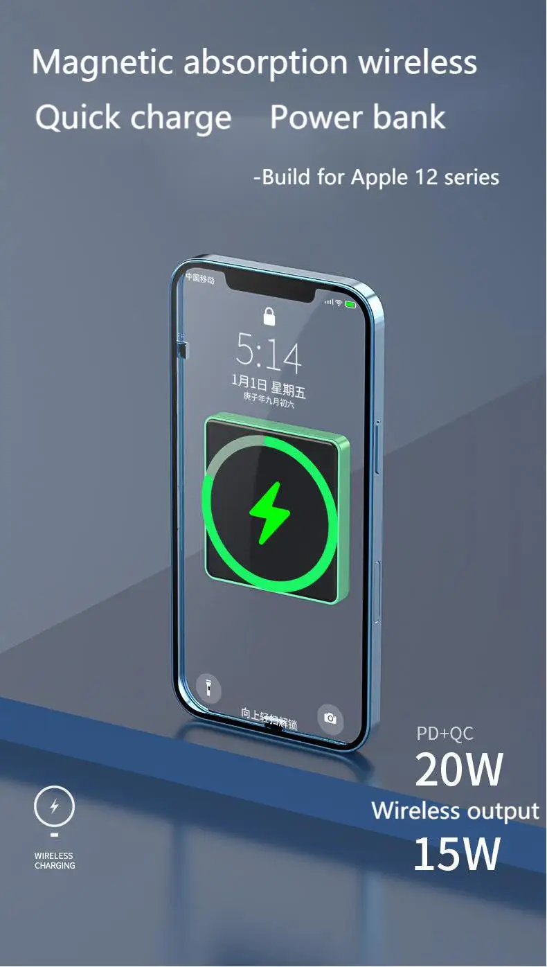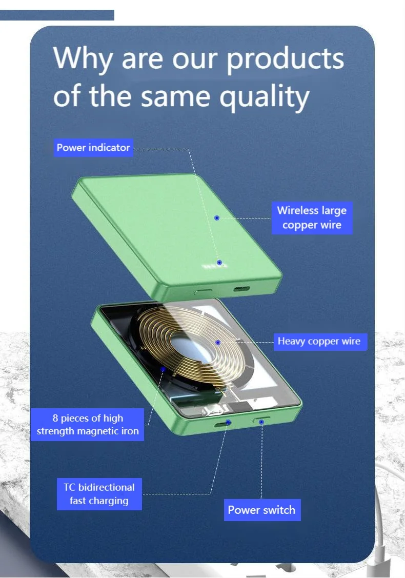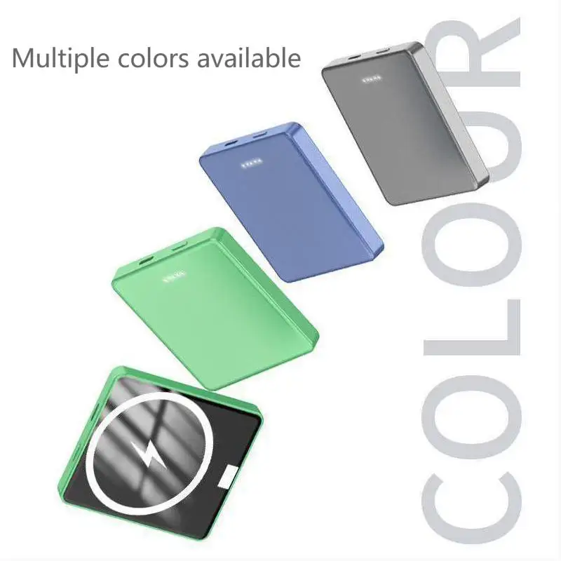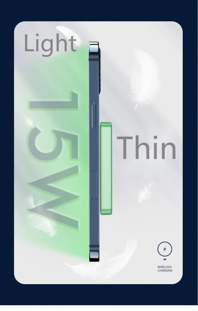 Product Description:Brand: Arvin[product name]: pd20w magnetic charge[product parameters]: pd20w power bank + 15W wireless charger[product capacity]: 5000mAh / 10000mah[product size]: 70 * 65 * 12mm / 70 * 65 * 18mmStandard configuration: package + machine + data line + instruction[color]: green, blue, gray[product features]:1. Pd20w magnetic absorption power bank + 15W wireless charging2. The charging protocol is stable and does not burn.