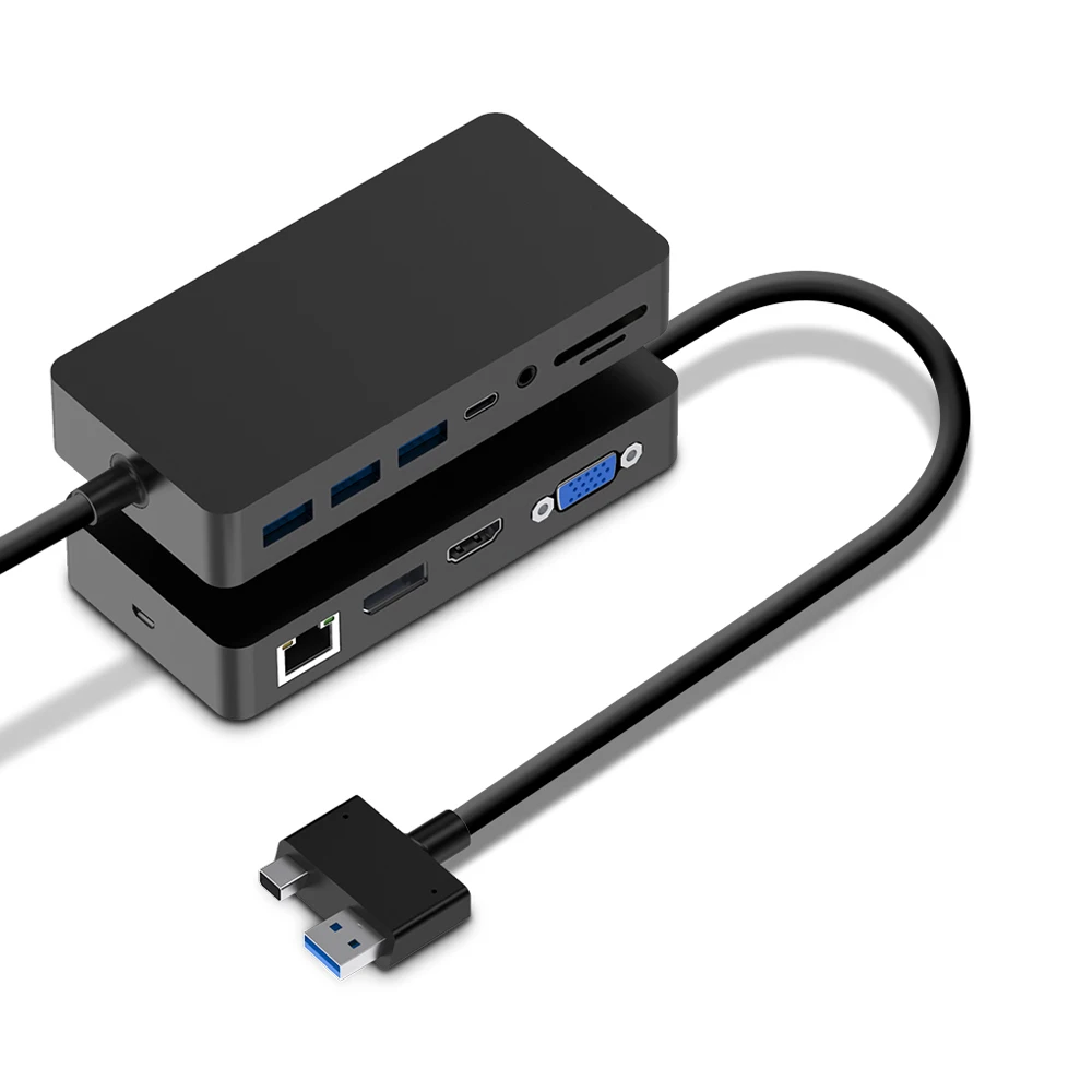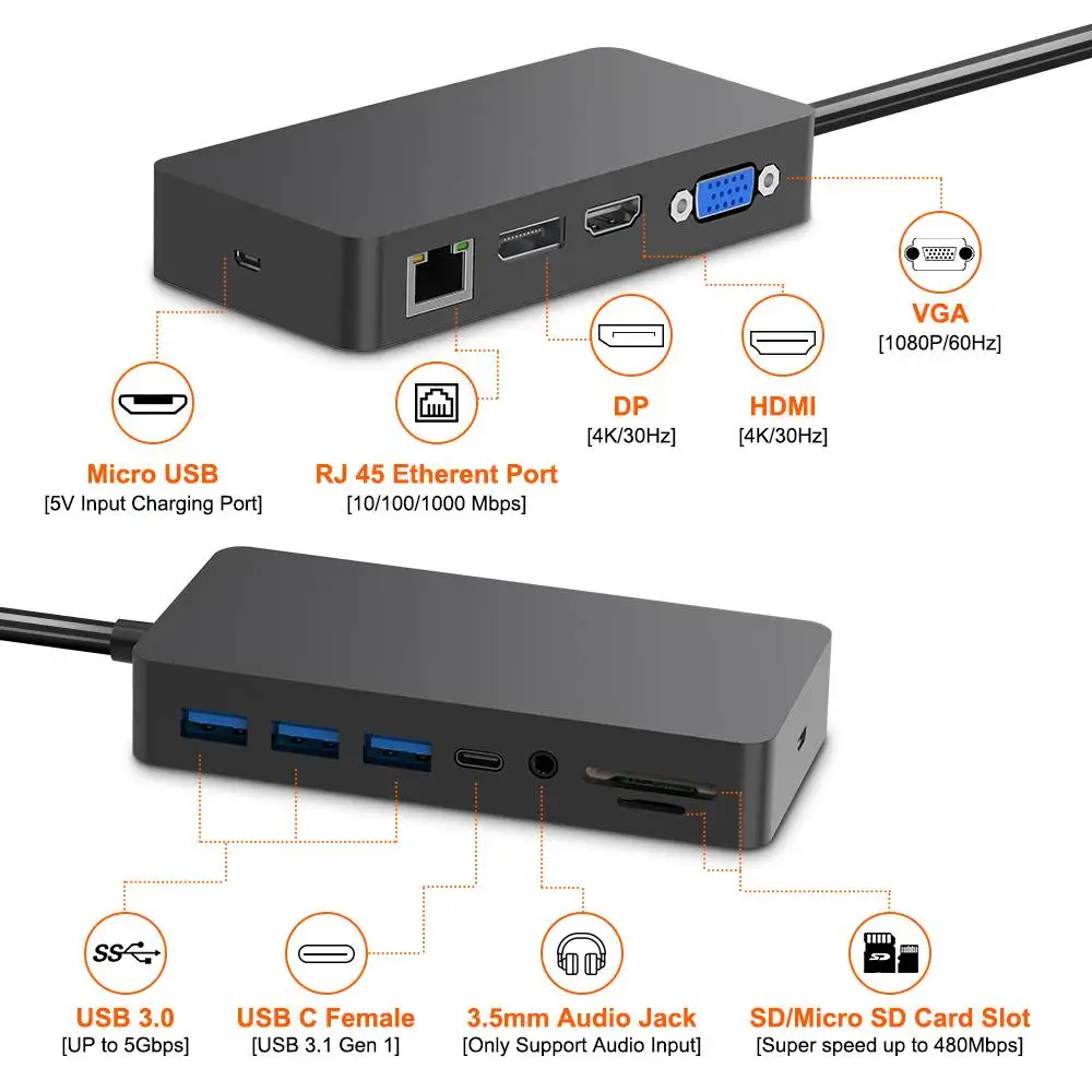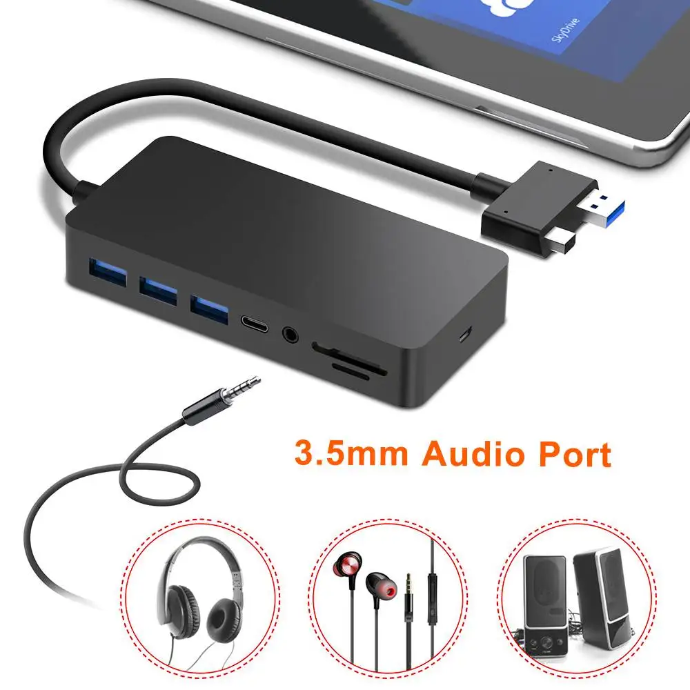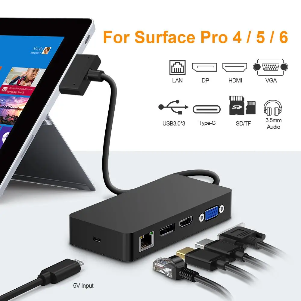 Note: not fit surface pro 3 and surface pro 7. Features: 1. Industry leading technology - Special design for Microsoft Surface pro 4/pro 5/pro6 including 3xUSB 3.0 port, 1xUSB C Data port, 1x1000Mb/s RJ45 Ethernet port, 1xHD port 4K/30Hz , 1xDP 4K/30Hz, 1xVGA 1080P, 1XMicro USB <5V Input Charging Port>, 1x3.5mm audio jack. Compact aluminum shell with solid quality. Easily release heat. Light-weight is convenient for travel or business trip. 2. Vivid 3D Effect Video Sync&Triple Display - Mirror or extend your screen with HD/VGA/DP,stream 4K UHD or Full HD 1080p video to HDTV,monitors,or projectors for a cinema-like visual feast.Support display 3 screens in the same screen or split screen mode,providing vivid HD quality videos & picture for an even better viewing experience. 3. RJ45 Ethernet and Effortless Data Transfer - Instant stable access to the Internet with the 1000M Ethernet port, anywhere and in just a flash. Backwards compatible with 10/100 Ethernet. Ultra-fast data transfer with a speed of 5Gbps for 3x USB 3.0 ports, a SD Card Slot and a TF Card Slot as Surface memory card reader. Backwards compatible with USB 2.0/1.1 devices . help your surface pro laptop better connect with the wireless mouse and keyboard. Note: The USB Hub also comes with the Micro USB port to get powered when connecting devices such as external hard drives. 4. Enjoy your favorite headphones - Delight listening to your favorite music using your wired headphones with the classic 3.5mm cable. Yes, that’s right, unlike 90% of the hubs out there, Eletrand premium jumbo hub features the 3.5mm audio jack. Note that it has no Microphone.